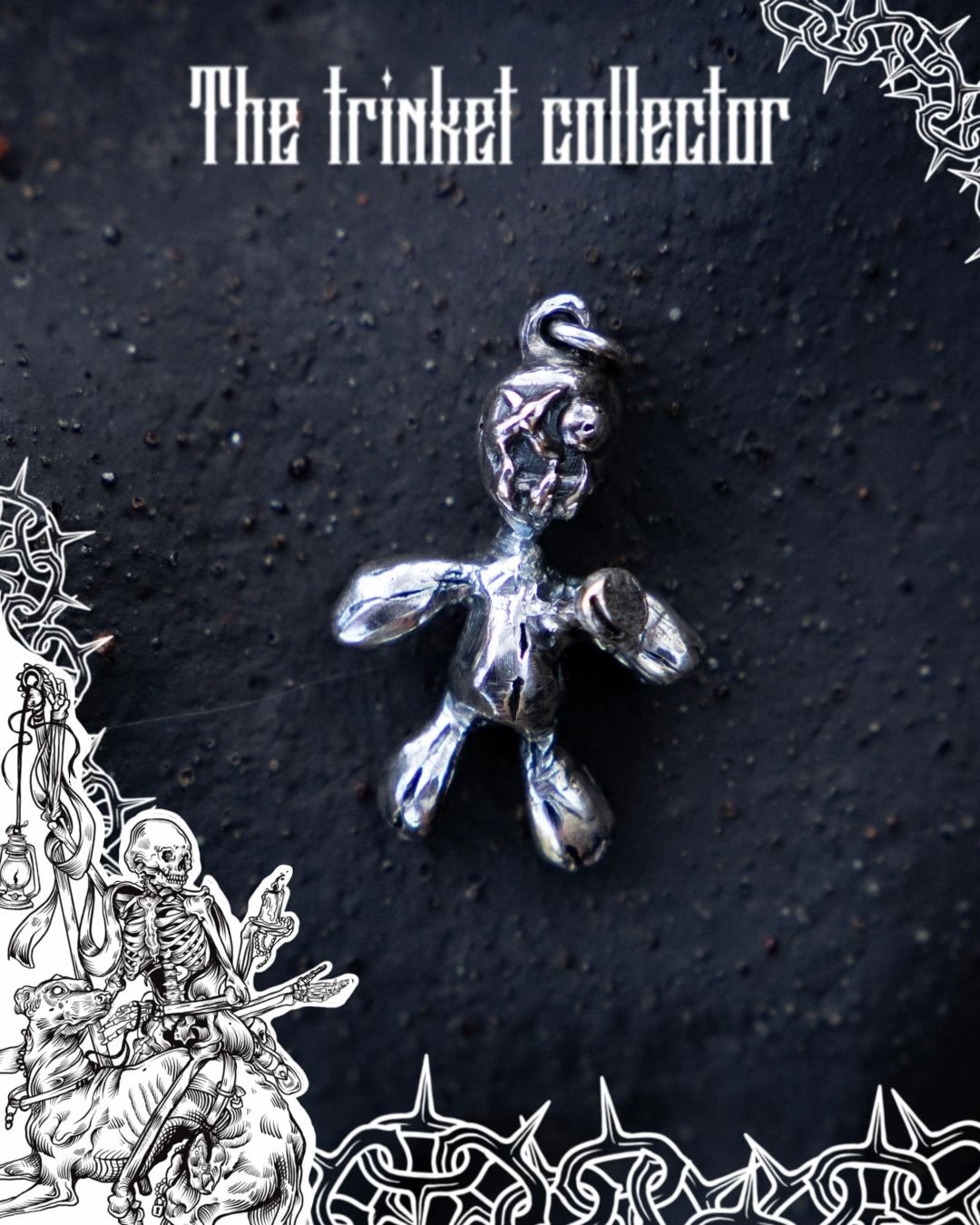 This charm is part of the Trinket Collector Series, a collaborative Fringe Group Studios project built around the celebration of tiny, peculiar treasures. Each selected trinket arrives in a cigarette-style box illustrated by ThistleSanctuary, paired with a matching collector card that expands the charm’s personality and quiet narrative weight.
